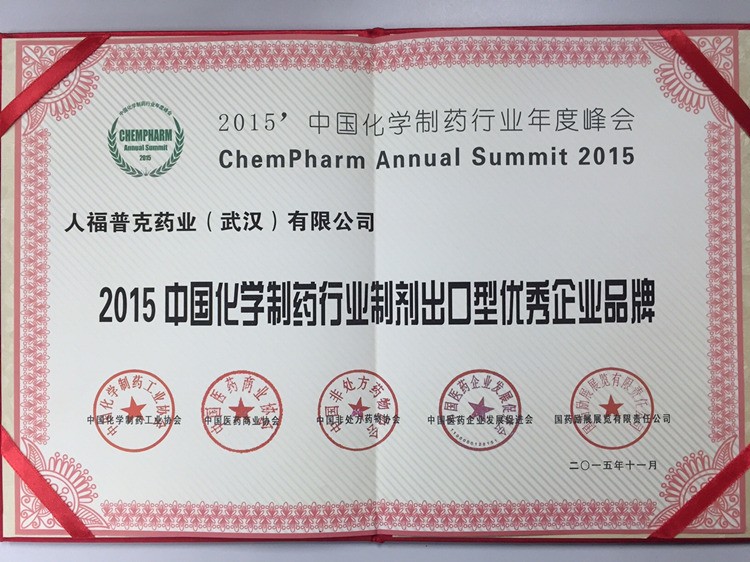 China's preparation export outstanding enterprise brand in chemical pharmaceutical industry in 2015 -